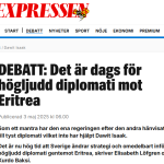 Efter 23 år av fruktlös tyst diplomati är det hög tid att Sverige ändrar strategi och omedelbart inför högljudd diplomati gentemot Eritrea, skriver Elisabeth Löfgren och Kurdo Baksi i en debattartikel publicerad i Expressen idag, den 3 maj, Internationella Pressfrihetsdagen.
